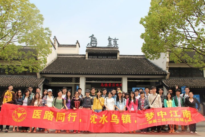 时维五月,序属暮春。4日早晨,浙医二院2012级硕士班同学30余人在班委会组织下游览乌镇。杭城山水都看尽,乌镇今始为君开。当日天朗气清,惠风和畅。同学们兴致勃勃,寻幽探古,尽情享受古镇的气息。乌镇地接苏杭,物阜民丰,素以“鱼米之乡,丝绸之府”闻名遐迩。她人杰地灵,才人辈出。远如六朝沈约,近如民国矛盾,乌镇人风骚独领,生命不息。市河穿镇而过,把乌镇分列南北。临河筑街,以岸为市;水市互依,浑然一体。两岸店铺林立,商旅如织。乌镇自古繁华,于今可见一斑。乌镇景致多以白墙黑瓦,小桥流水,相映成趣;加之点缀其间的绿荫,一幅绢丝的江南水墨图沁人心脾。雕梁画栋,彰显千年古韵;亭台楼阁,诉说昔日辉煌。同学们三五成群,或走访古迹名胜,或徜徉商肆人家,或荡漾短棹轻舟。看巷陌斜阳,闻橹声唉乃,醉然其间。当晚同学们安顿完毕,夜游乌镇。乌镇夜景,自然与白天不同。水灯相映,浮光跃金,一派辉煌气象;至于寂寥石巷,灯火阑珊,人约黄昏,亦别有一番滋味。作家陈运和赞道,“一个现代文明影响不大的世界, 一张古老色彩依然浓重的史页”。乌镇啊乌镇,一幅重彩浓墨的水乡画卷,深印在大家的记忆中,在回程的大巴上慢慢地回味,久久地淡不下去……