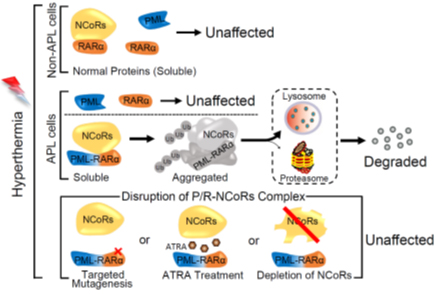 在本期论文中,Maimaitiyiming及其合作者证明了热激诱导PML/RARA融合癌蛋白的稳定性下降作用是由核受体辅阻遏物(NCoRs)的聚集驱动的。热疗具有与ATO协同降解PML/RARA的作用,并能够克服ATO耐药。这种新颖的方法可以延伸应用于其他与NCoRs相关的融合癌蛋白中。