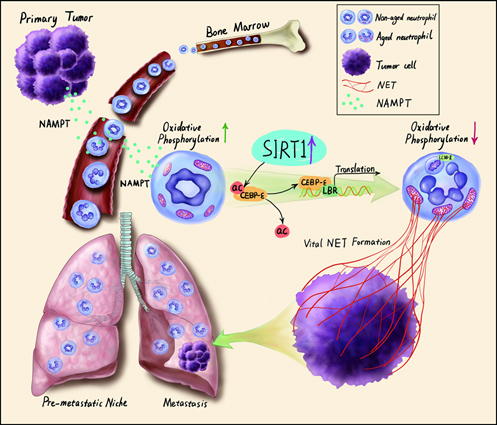 模式图:原发肿瘤分泌NAMPT可以诱导外周血中性粒细胞极化为衰老中性粒细胞并募集于肺组织,衰老中性粒细胞中SIRT1显著上调,促进细胞核过分叶并形成线粒体依赖的胞外捕获网,捕捉循环肿瘤细胞形成肺转移。