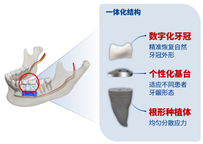 针对现有种植体与自然牙根形态差异大的问题,本项目通过改进3D打印激光熔融技术,对加工件进行轴向和周向的梯度化分割,并进一步将牙冠、基台和植体集成于一体,形成与自然牙外形高度一致仿生种植牙,植入体内后可避免损伤神经血管等重要解剖结构。